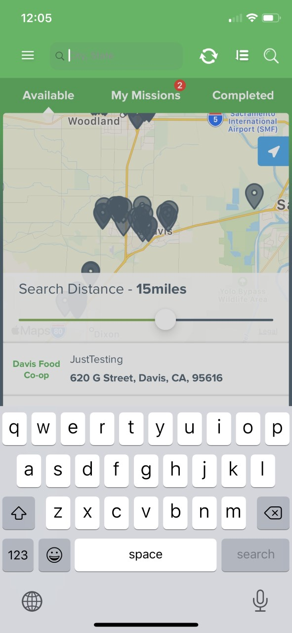 to ensure the Missions app locates your exact location > below the map, slide the “Search Distance” toggle from 1mile to 25miles based on the radius of your preference > click the blue “Show Missions” button below for results of missions available to reserve